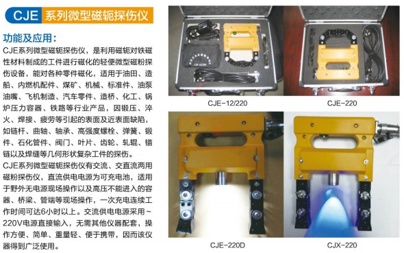 CJE系列微型磁軛探傷儀有交流、直流、交直流兩用磁粉探傷儀,直流供電電源為可充電池,適用于野外無電源現(xiàn)場(chǎng)操作以及高壓不能進(jìn)入的容器、橋梁、管道等現(xiàn)場(chǎng)操作,一次充電連續(xù)工作時(shí)間可達(dá)6小時(shí)以上。交流供電電源采用220V電源直接輸入,無需其他儀器配套,操作方便、簡單、重量輕、便于攜帶,因而該儀器得到廣泛使用。